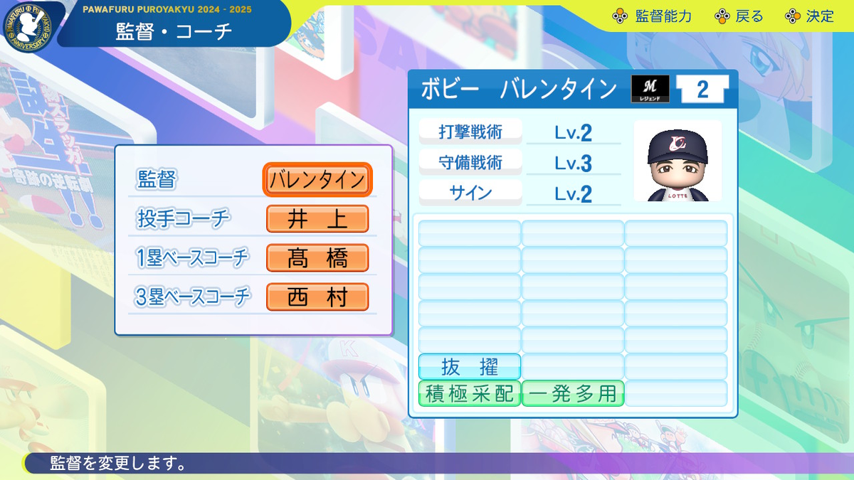 バレンタイン監督:パワナンバー 12800 00397 75191(マロ様作成)優勝回数 1回